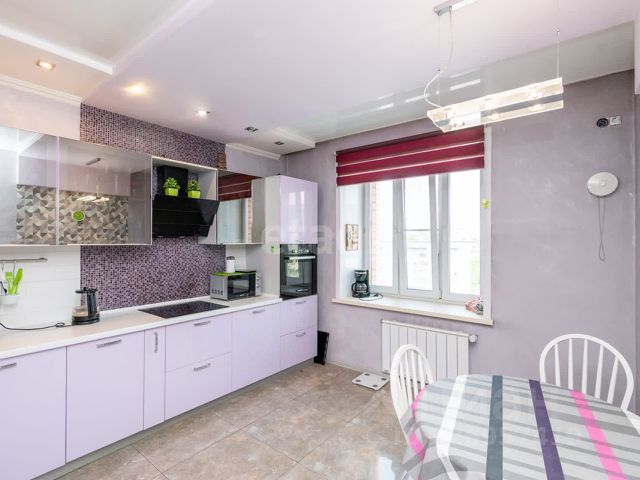 Кухня оборудована гарнитуром с подсветкой рабочей зоны и встроенной техникой (духовой шкаф, варочная панель, вытяжка).