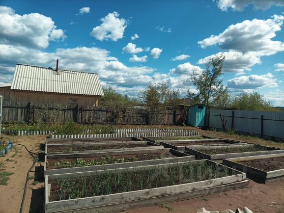 Плодовые кустарники (жимолость, малина, смородина, ранет, черемуха и клубника), две большие теплицы и оцинкованные грядки. Земля тщательно удобрена и каждый год радует отличным урожаем, а многолетники - своим цветением.