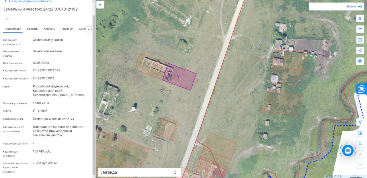 Земельный участок из категории земель земли населенных пунктов, с кадастровым номером 24:22:0701012:192, общей площадью 1500 кв.м., по адресу(местоположение): Российская Федерация, Красноярский край, Краснотуранский район, с. Саянск, ул. Трактовая, 6, с разрешенным использованием для ведения личного подсобного хозяйства (приусадебный земельный участок), сроком на 20 лет. Начальная стоимость права аренды земельного участка составляет 2400,00 (Две тысячи четыреста) рублей 00 коп., в год.