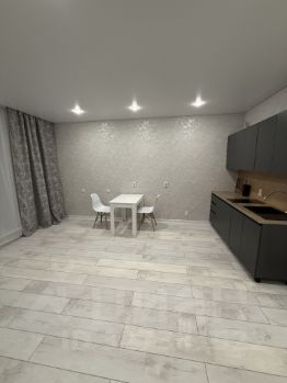 В квартире выполнен дизайнерский ремонт. Просторная кухня оснащена необходимой бытовой техникой, включая холодильник. В наличии шкаф для хранения вещей.