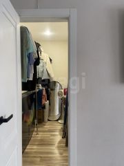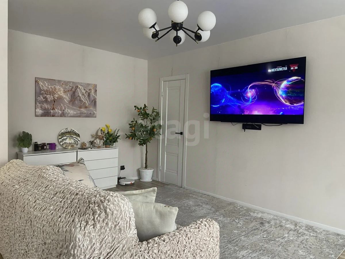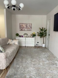 В просторной светлой гостиной находятся диван, комод и телевизор, а также удобная закрытая гардеробная и выход на балкон.