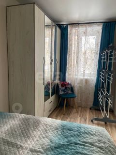 В спальне двуспальная кровать и вместительный шкаф.