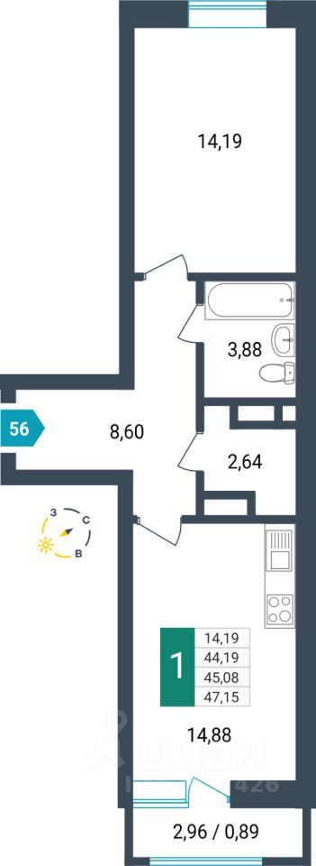 Продаётся 1-комнатная квартира в строящемся доме (Секция 1), срок сдачи: I-кв. 2026, общей площадью 45.08 кв.м., на 5 этаже. Новый жилой комплекс от специализированного застройщика "Мир"