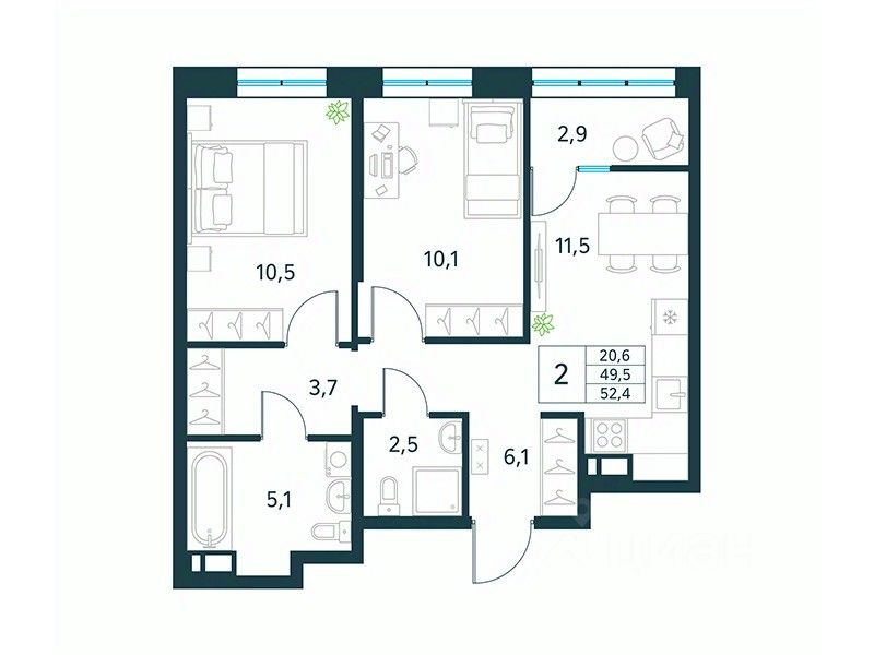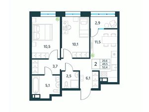 Продается 2-комн. квартира площадью 52,4 кв.м, без отделки. Квартира расположена на 16 этаже 18 этажного монолитного дома (Литер 1 (3 очередь), Секция 1) в ЖК "Хороший" от АТОЛЛ.