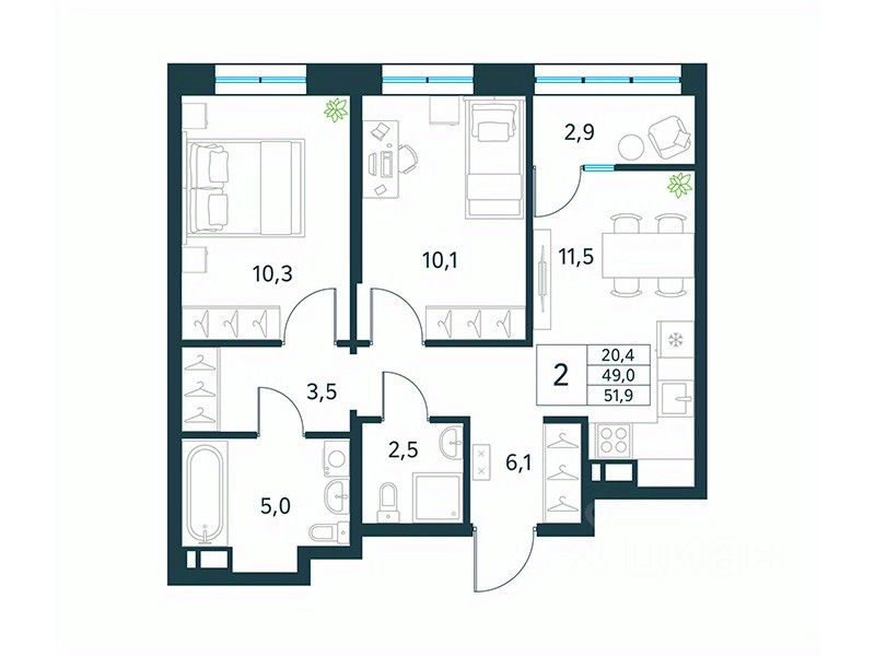 Продается 2-комн. квартира площадью 51,9 кв.м, без отделки. Квартира расположена на 11 этаже 18 этажного монолитно-кирпичного дома (Литер 2 (3 очередь), Секция 1) в ЖК "Хороший" от АТОЛЛ.