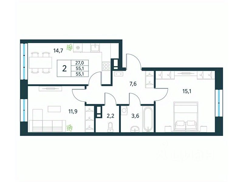 Продается 2-комн. квартира площадью 55,1 кв.м, без отделки. Квартира расположена на 3 этаже 18 этажного монолитного дома (Литер 1 (3 очередь), Секция 1) в ЖК "Хороший" от АТОЛЛ.