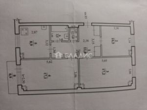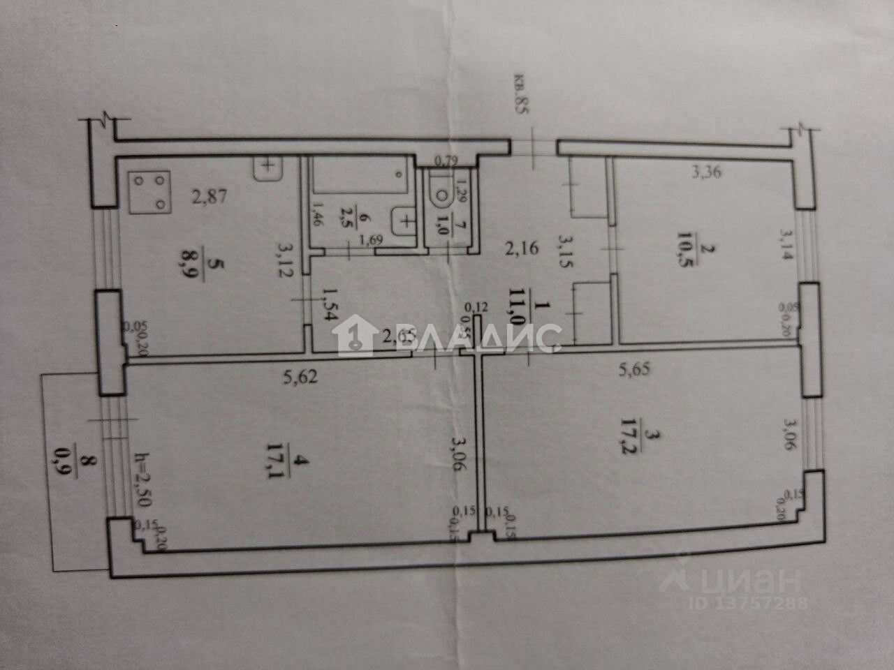 Квартира расположена на последнем этаже пятиэтажного панельного дома. Общая площадь составляет 68,4 кв. м, жилая — 43,2 кв. м. Есть три изолированные комнаты с площадями 8,9 кв. м, 17,1 кв. м и 17,2 кв. м, кухня — 10,5 кв. м, а также балкон. Окна выходят на улицу и во двор.