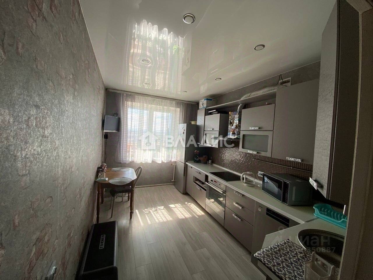 Потолки натяжные, на стенах обои, на полу ламинат.