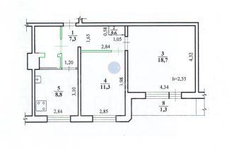 Общая площадь квартиры составляет 54 кв. м, две изолированные комнаты (18,7 кв. м и 11,3 кв. м) ,просторная кухня площадью 8,8 кв. м станет местом для создания кулинарных шедевров.