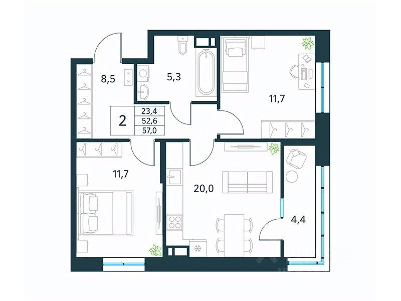 Продается 2-комн. квартира площадью 57 кв.м, без отделки. Квартира расположена на 12 этаже 18 этажного монолитного дома (Литер 1 (3 очередь), Секция 1) в ЖК "Хороший" от АТОЛЛ.
