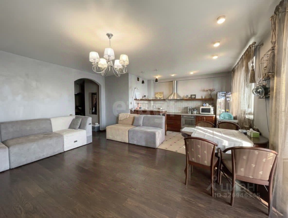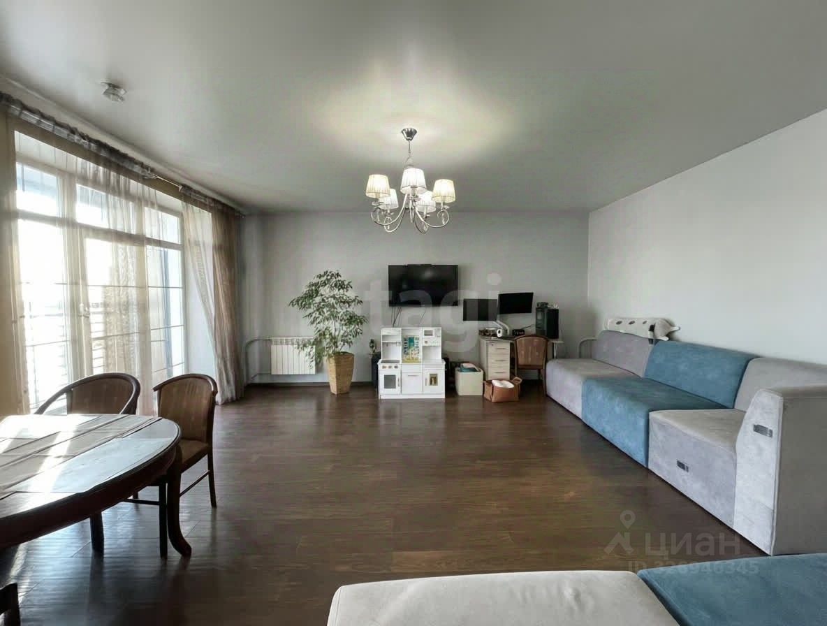 Просторная гостиная украшена роскошным французским окном в пол, открывающим выход на большую лоджию с захватывающим дух панорамным видом на город.