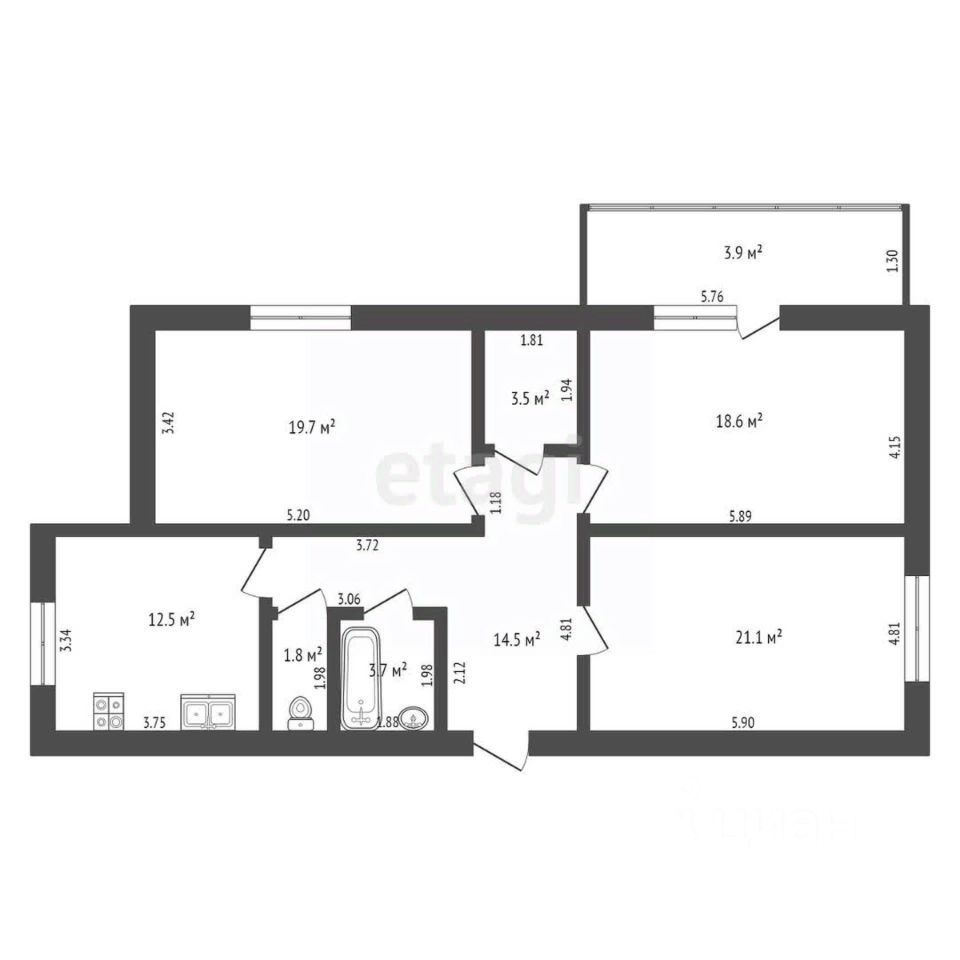 Функциональная гармоничная планировка включает в себя большую кухню 12,5 кв.м, три комнаты ~ 19,7; 18,6 и 21,1 кв.м., просторный коридор 14,5 кв.м., вместительная гардеробная.