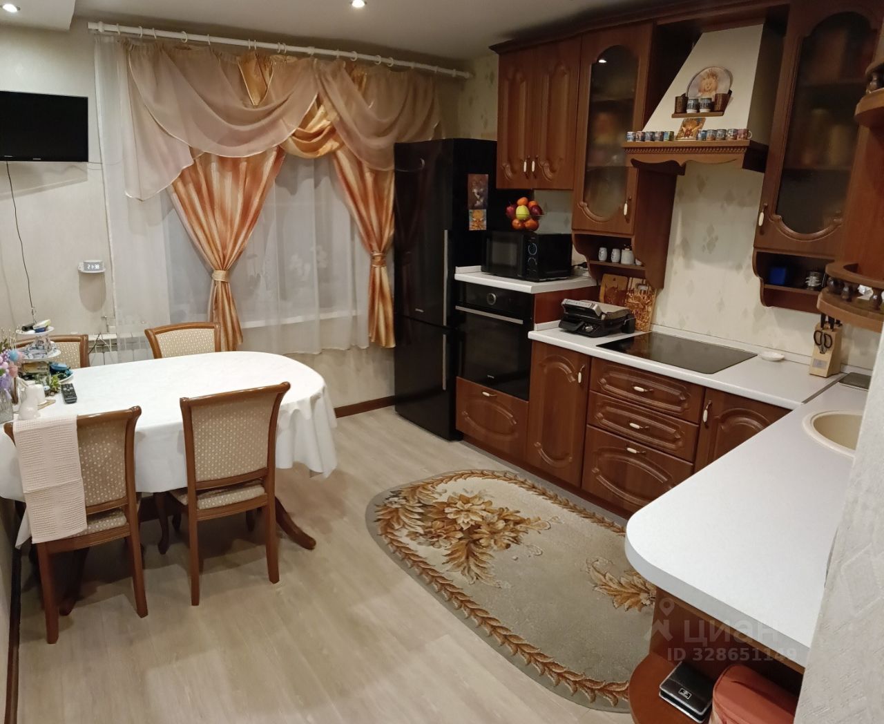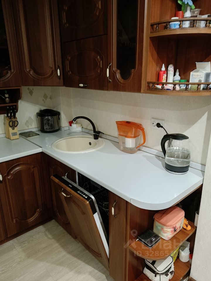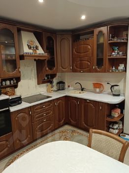 Кухня 10 м², квадратная, что позволяет по максимуму использовать пространство. Напольное покрытие плитка ПВХ. На кухне остаётся кухонный гарнитур со встроенной техникой (кроме духового шкафа).