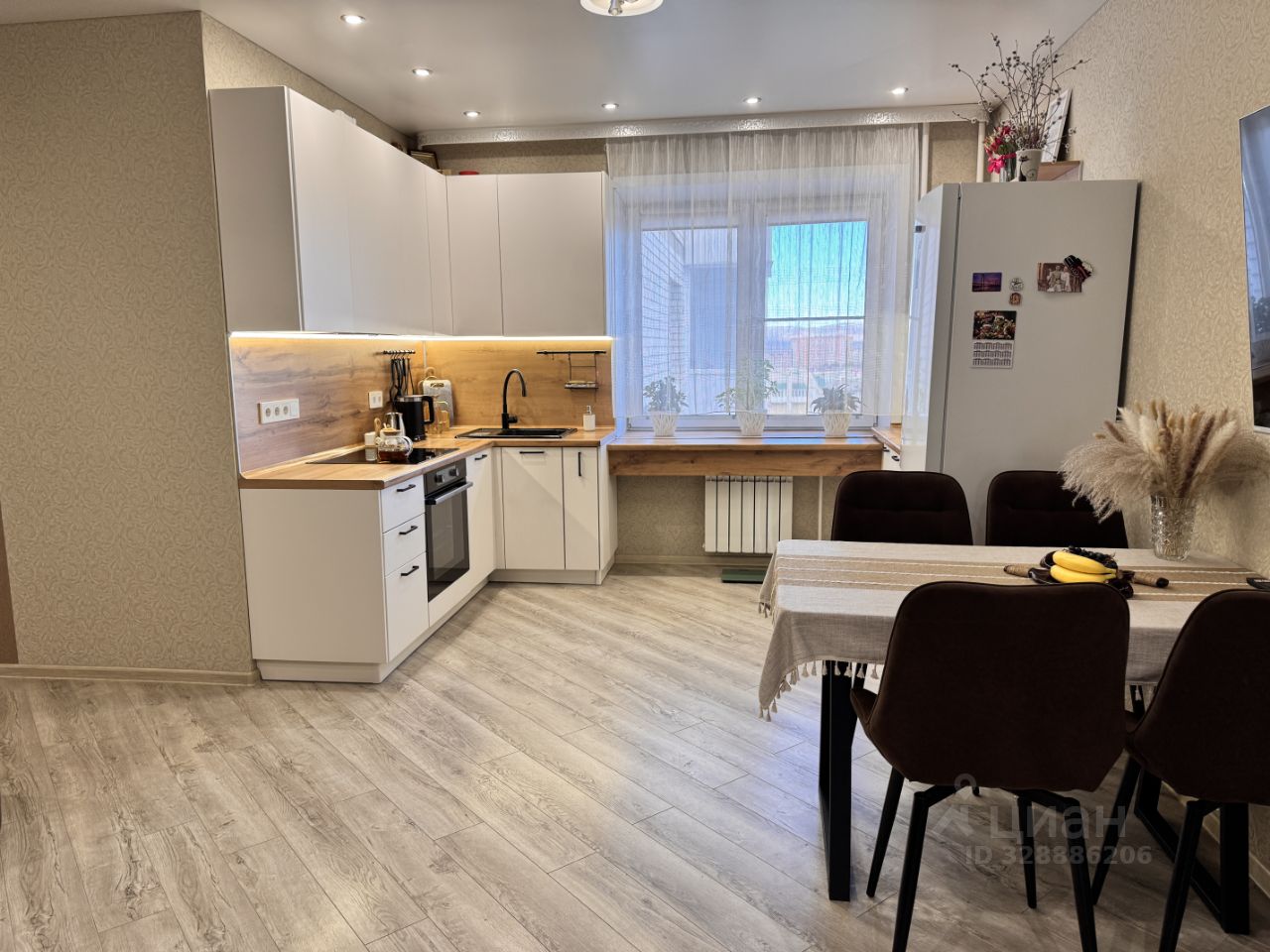 • Кухня-гостиная станет местом притяжения для Вашей семьи и гостей. Кухонный гарнитур со встроенной техникой отличается стилем, удобством и вместительностью. Обеденный стол сделан из массива дерева.