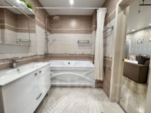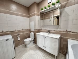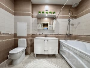 • Просторный санузел совмещен, установлена тумба-раковина, унитаз, ванна, стиральная машина. Плитка в хорошем состоянии.