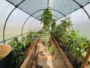 На 10 сотках земли имеются две большие теплицы из поликарбоната, грядки, насаждения малины, смородины, облепихи, черемухи, голубые ели, разработанное картофельное поле.