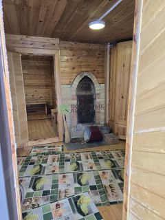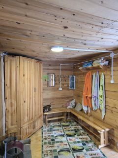 -Большая баня, которую можно считать вторым домом на даче. Большая парилка и помоечная, очень большой предбанник. Стены отделаны евровагонкой. Все очень стильно и красиво. Баня сложена из 18-го бруса с облицовкой красивым сайдингом;