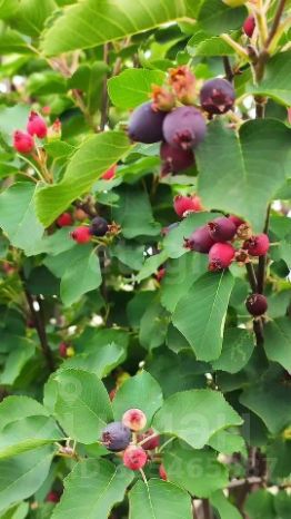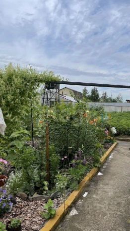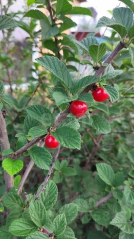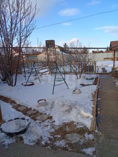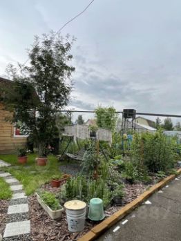 Между баней и беседкой расположился сад с фруктовыми деревьями и качелями. На участке высажены плодовые деревья и кустарники: сливы, вишня, ранет, жимолость, смородина, малина, ирга, крыжовник и рябина.