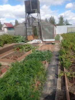 Хорошо продуманную и обустроенную зону огорода возглавляет вместительная теплица из металла и поликарбоната 5,30*10, которая вмещает в себя все насаждения (помидоры, перцы и огурцы, здесь же редис и зелень). В теплице установлена автоматическая система проветривания, а на возможные заморозки имеется печь. Рядом установлен бак с водой, которого хватает для удобной поливки из шланга на теплицу и грядки (6 штук).
