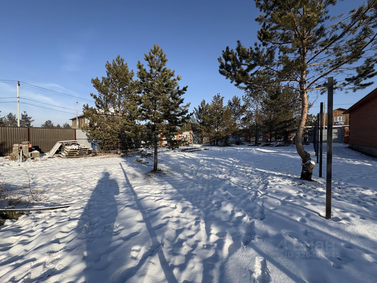 Участок ровный прямоугольный с соснами .