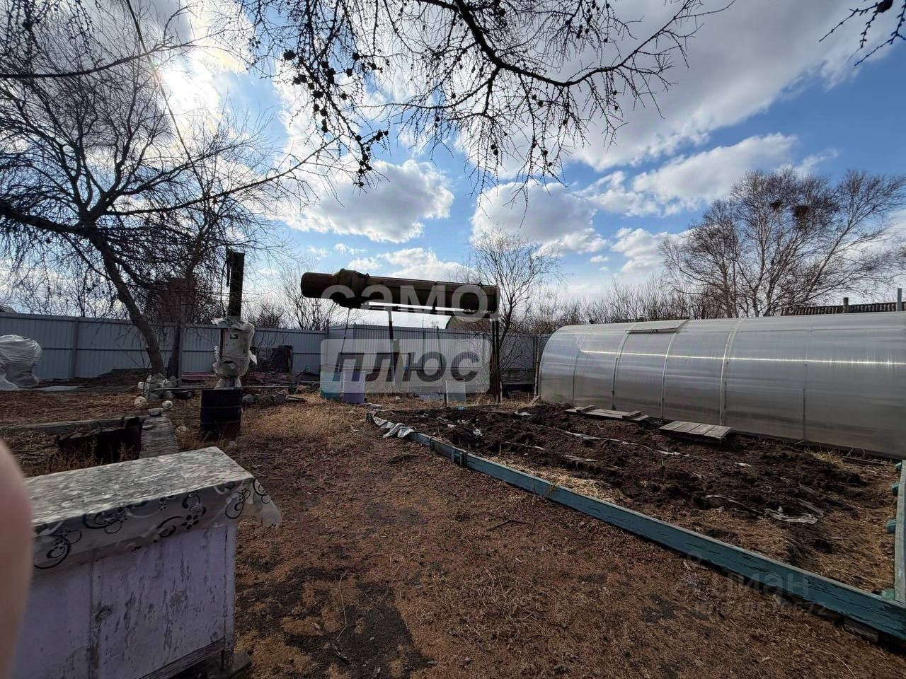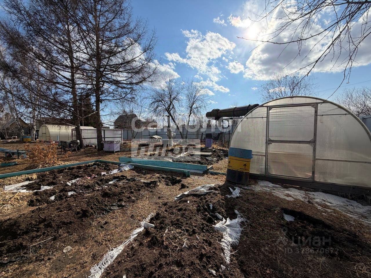 На участке установлена теплица, насаждения малины.