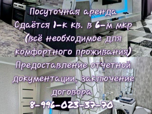 Сдаётся уютная 1-к квартира в 6 мкр. В квартире имеется всё необходимое для комфортного проживания (Холодильник, Телевизор, Wi-Fi, электрическая плита, микроволновка, чайник, фен, стиральная машина, чистое постельное белье и полотенца, средства гигиены). Возможна аренда лицами с 18 лет. Обязательно заключение договора, предоставление отчетной документации. Квартира не сдаётся для проведения праздников и вечеринок! Расчетный час 14 часов, при утреннем заезде, квартира бронируется с вечера( т. е. оплачиваются дополнительные сутки)! Залог 2000, возвращается при выезде, если нет оснований для удержания